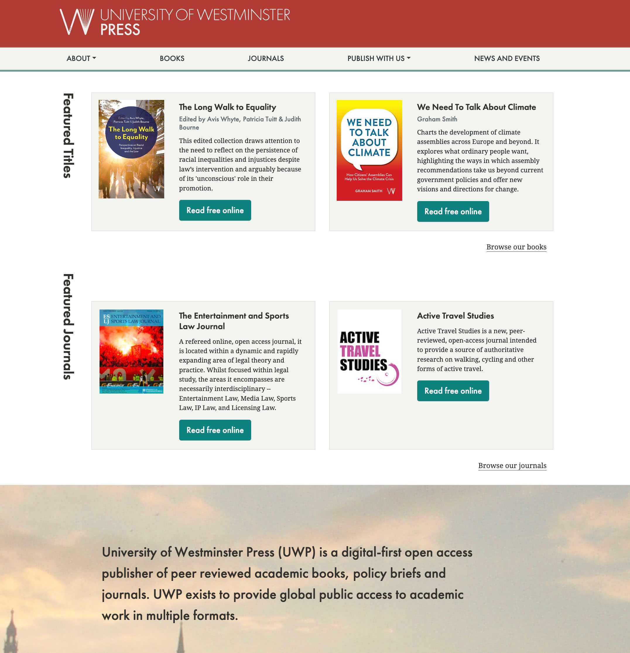 UWP currently hosts six well-respected journals, and has published 58 open-access books, with at least eight more to be published in the next ten months. It is committed to being an entirely open-access, open-source, university-owned publisher, aligned with academic publishing best-practice values of research integrity, intellectual freedom, equity and inclusion, and responsible stewardship.